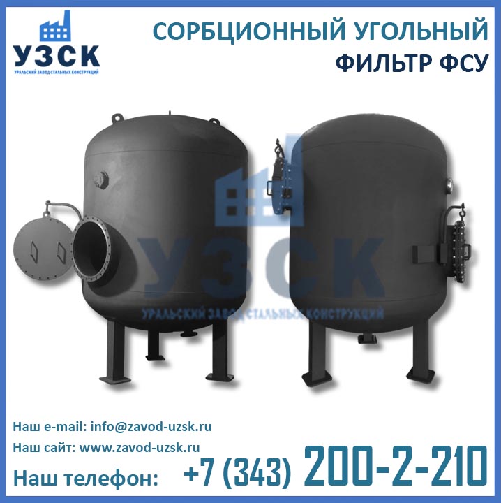 Фильтры ФСУ 1.0-0.6 – это сорбционные угольные фильтры, предназначенные для обезмасливания воды и парового конденсата, удаления посторонних привкусов, запахов, остатков нефтепродуктов и органических примесей путем сорбции (впитывания). Процесс фильтрации осуществляется с помощью сорбента, который засыпается в корпус аппарата. Зачастую в роли впитывающего материала выступает коксовый, древесный или каменный активированный уголь, но могут применяться и прочие сорбенты, к примеру, цеолит, МИУ-С, алюмосиликаты и др.