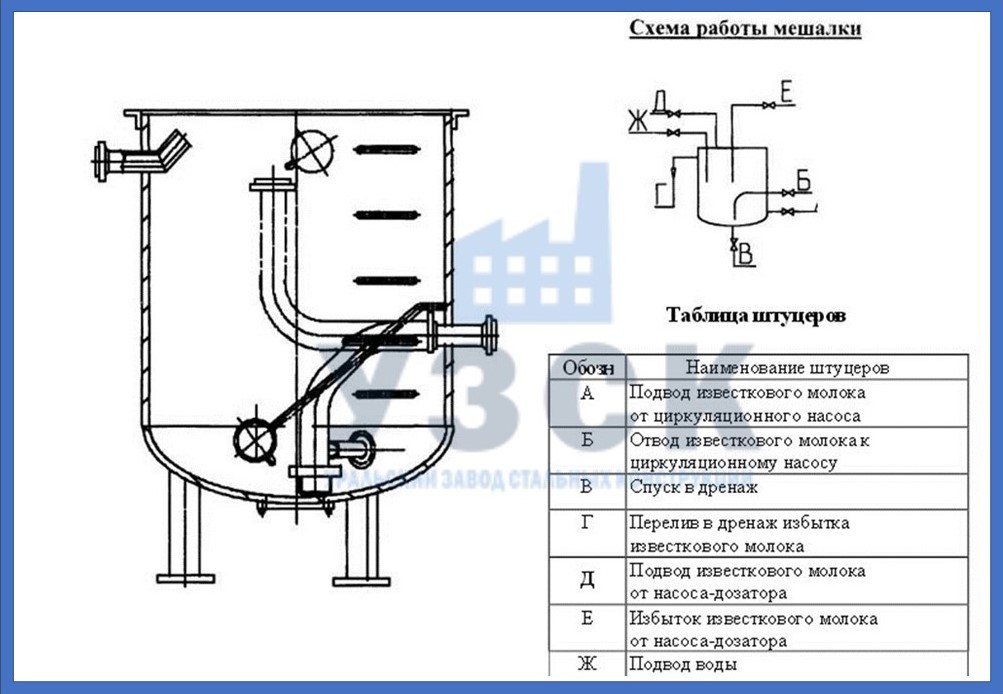 Мешалки МГИ используются для приготовления суспензии известкового молока после гашения с непрерывным размешиванием. И все-таки часть крупных частиц оседает, откачиваясь через дренажное отверстие.